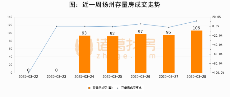 从存量房来看,2025年03月28日扬州存量房单日成交106套,比昨日增加11套,环比上涨11.6%。从近一周存量房成交来看,扬州存量房日均成交套数为69套,03月28日单日成交106套,高于近一周平均水平53.6%。