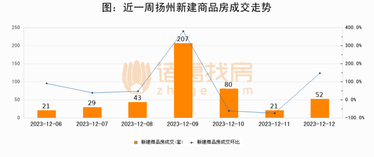 根据扬州市住房和城乡建设局数据显示,2023年12月12日扬州新建商品房成交52套,较昨日增加31套,环比上涨147.6%