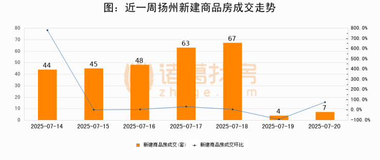 根据扬州市住房和城乡建设局数据显示,2025年07月20日扬州新建商品房成交7套,较昨日增加3套,环比上涨75%