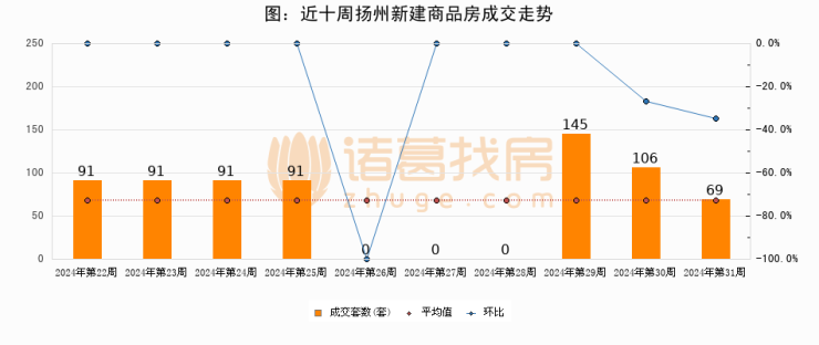 进入2024年第31周(07月29日-08月04日),扬州新建商品房成交69套,较上周减少37套,环比下降34.9%