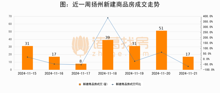 根据扬州市住房和城乡建设局数据显示,2024年11月21日扬州新建商品房成交17套,较昨日减少34套,环比下降66.7%