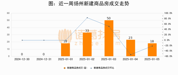 根据扬州市住房和城乡建设局数据显示,2025年01月05日扬州新建商品房成交18套,较昨日减少5套,环比下降21.7%