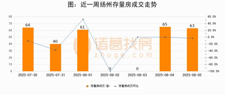 从存量房来看,2025年08月05日扬州存量房单日成交63套,比昨日减少2套,环比下降3.1%。从近一周存量房成交来看,扬州存量房日均成交套数为41套,08月05日单日成交63套,高于近一周平均水平53.7%。