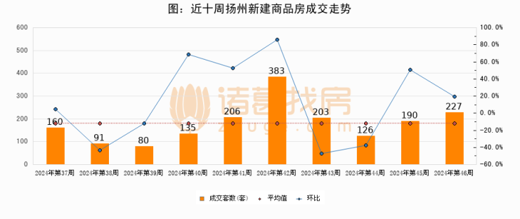 进入2024年第46周(11月11日-11月17日),扬州新建商品房成交227套,较上周增加37套,环比上涨19.5%