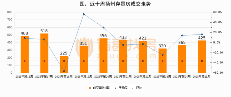 存量房方面,第25周扬州存量房成交425套,较上周增加60套,环比上涨16.4%。从近十周成交走势来看,周均成交套数为400套,本周高于平均水平6.2%。