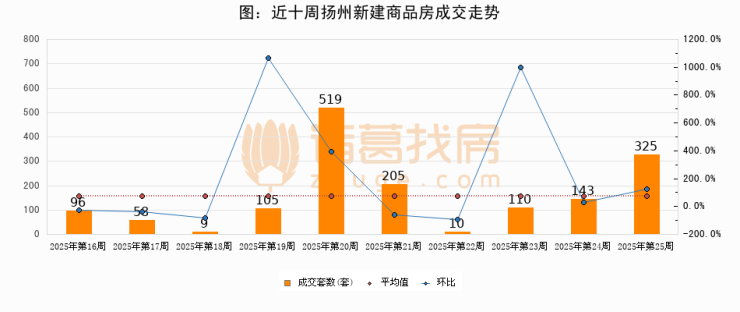 进入2025年第25周(06月16日-06月22日),扬州新建商品房成交325套,较上周增加182套,环比上涨127.3%