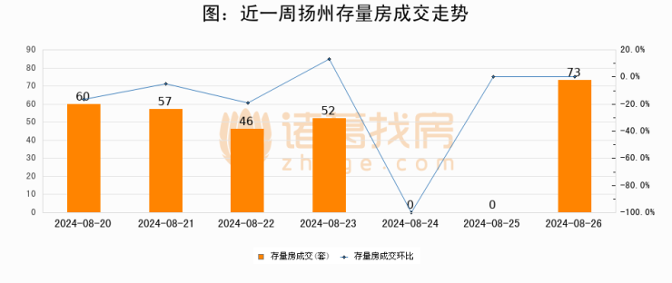 从存量房来看,2024年08月26日扬州存量房单日成交73套,比昨日增加73套,环比上涨0%。从近一周存量房成交来看,扬州存量房日均成交套数为41套,08月26日单日成交73套,高于近一周平均水平78%。