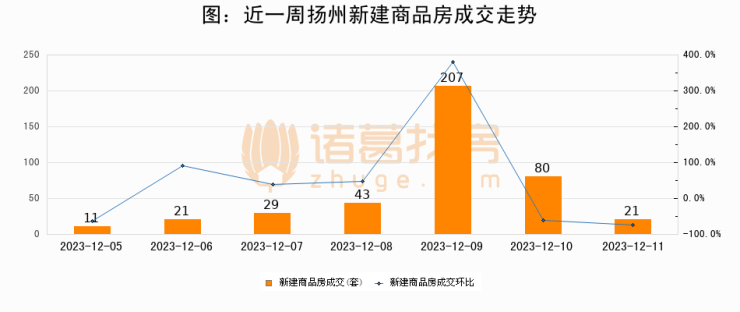 根据扬州市住房和城乡建设局数据显示,2023年12月11日扬州新建商品房成交21套,较昨日减少59套,环比下降73.8%。近一周扬州新建商品房日均成交59套。12月11日单日成交21套,低于近一周平均水平64.4%。