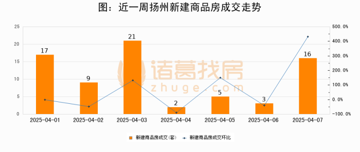 根据扬州市住房和城乡建设局数据显示,2025年04月07日扬州新建商品房成交16套,较昨日增加13套,环比上涨433.3%