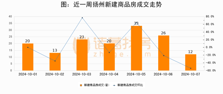 根据扬州市住房和城乡建设局数据显示,2024年10月07日扬州新建商品房成交12套,较昨日减少14套,环比下降53.8%