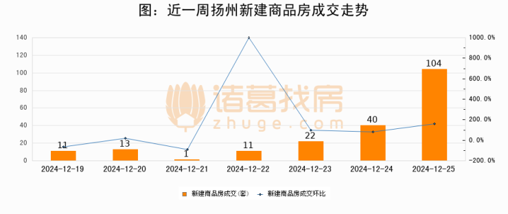 根据扬州市住房和城乡建设局数据显示,2024年12月25日扬州新建商品房成交104套,较昨日增加64套,环比上涨160%