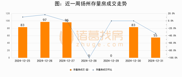 从存量房来看,2024年12月31日扬州存量房单日成交55套,比昨日减少28套,环比下降33.7%。从近一周存量房成交来看,扬州存量房日均成交套数为59套,12月31日单日成交55套,低于近一周平均水平6.8%。