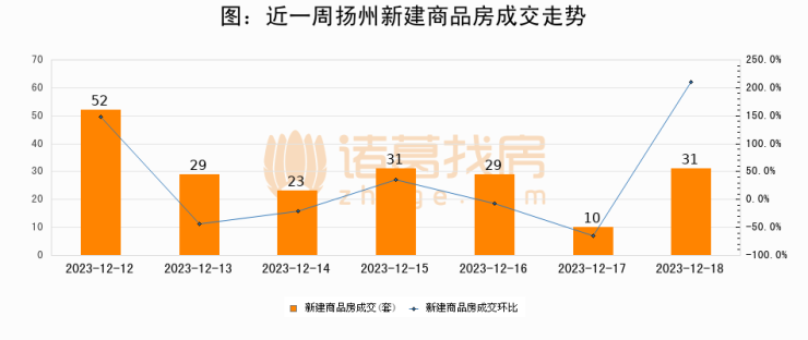 根据扬州市住房和城乡建设局数据显示,2023年12月18日扬州新建商品房成交31套,较昨日增加21套,环比上涨210%