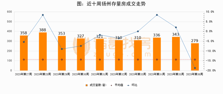 存量房方面,第36周扬州存量房成交279套,较上周减少64套,环比下降18.7%。从近十周成交走势来看,周均成交套数为332套,本周低于平均水平16%。