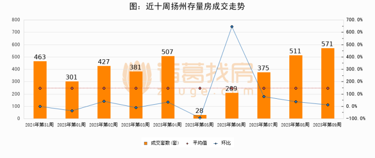 存量房方面,第09周扬州存量房成交571套,较上周增加60套,环比上涨11.7%。从近十周成交走势来看,周均成交套数为377套,本周高于平均水平51.5%。