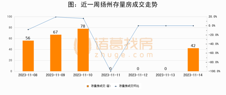从存量房来看,2023年11月14日扬州存量房单日成交42套,比昨日增加42套,环比上涨0%。从近一周存量房成交来看,扬州存量房日均成交套数为34套,11月14日单日成交42套,高于近一周平均水平23.5%。