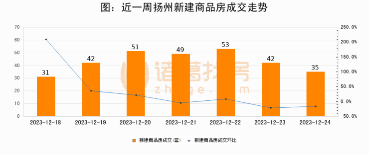 根据扬州市住房和城乡建设局数据显示,2023年12月24日扬州新建商品房成交35套,较昨日减少7套,环比下降16.7%