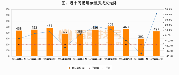 存量房方面,第02周扬州存量房成交427套,较上周增加126套,环比上涨41.9%。从近十周成交走势来看,周均成交套数为429套,本周低于平均水平0.5%。