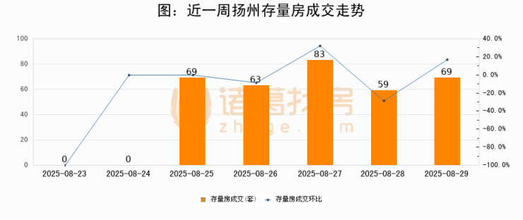 从存量房来看,2025年08月29日扬州存量房单日成交69套,比昨日增加10套,环比上涨17%。从近一周存量房成交来看,扬州存量房日均成交套数为49套,08月29日单日成交69套,高于近一周平均水平40.8%。