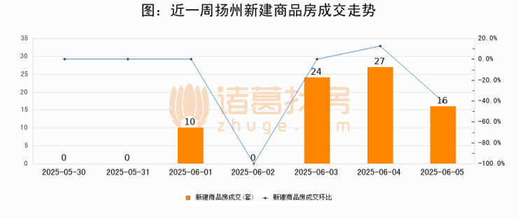 根据扬州市住房和城乡建设局数据显示,2025年06月05日扬州新建商品房成交16套,较昨日减少11套,环比下降40.7%