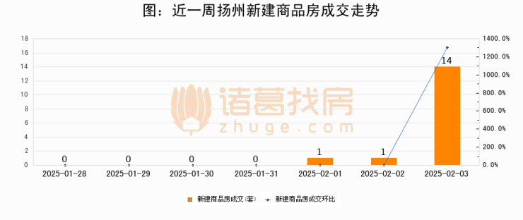 根据扬州市住房和城乡建设局数据显示,2025年02月03日扬州新建商品房成交14套,较昨日增加13套,环比上涨1300%
