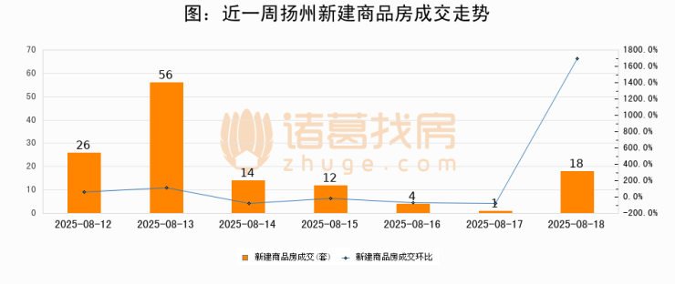 根据扬州市住房和城乡建设局数据显示,2025年08月18日扬州新建商品房成交18套,较昨日增加17套,环比上涨1700%