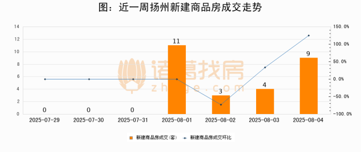 根据扬州市住房和城乡建设局数据显示,2025年08月04日扬州新建商品房成交9套,较昨日增加5套,环比上涨125%