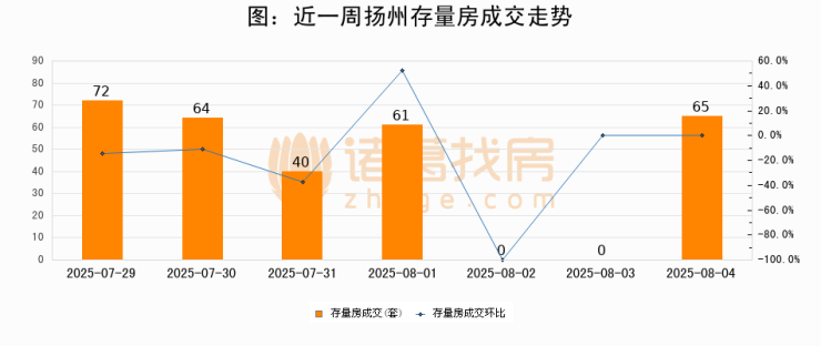 从存量房来看,2025年08月04日扬州存量房单日成交65套,比昨日增加65套,环比上涨0%。从近一周存量房成交来看,扬州存量房日均成交套数为43套,08月04日单日成交65套,高于近一周平均水平51.2%。