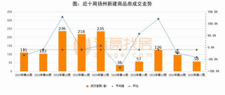 进入2025年第17周(04月21日-04月27日),扬州新建商品房成交58套,较上周减少38套,环比下降39.6%