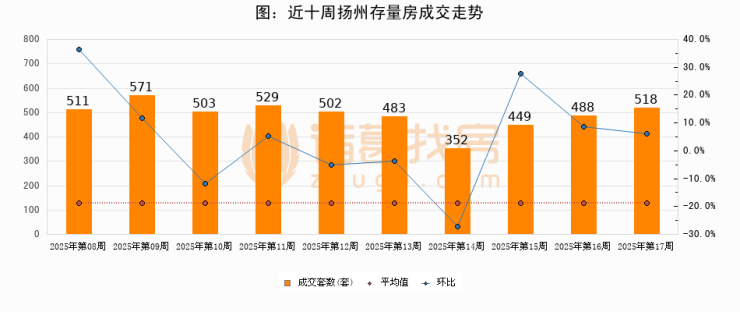 存量房方面,第17周扬州存量房成交518套,较上周增加30套,环比上涨6.2%。从近十周成交走势来看,周均成交套数为490套,本周高于平均水平5.7%。