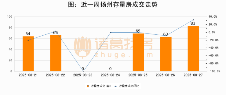 从存量房来看,2025年08月27日扬州存量房单日成交83套,比昨日增加20套,环比上涨31.8%。从近一周存量房成交来看,扬州存量房日均成交套数为49套,08月27日单日成交83套,高于近一周平均水平69.4%。