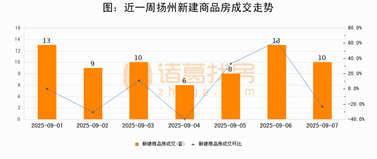 根据扬州市住房和城乡建设局数据显示,2025年09月07日扬州新建商品房成交10套,较昨日减少3套,环比下降23.1%
